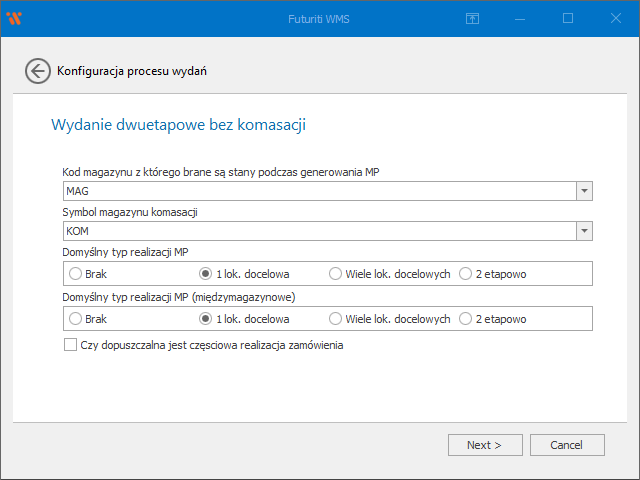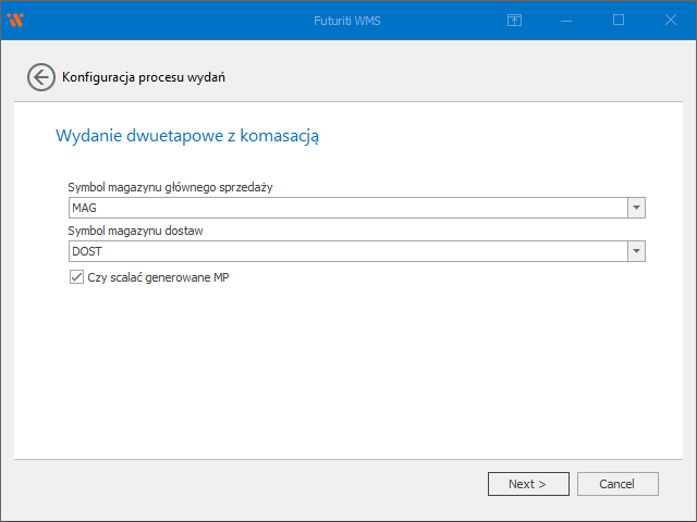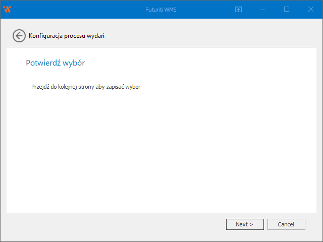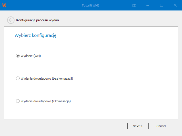W celu skonfigurowania procesu wydań bez komasacji należy wybrać drugą opcję i zatwierdzić klikając Next