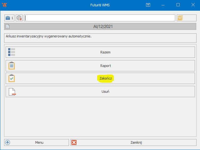 - Po zakończeniu realizacji wszystkich odczytów (zeskanowania wszystkich towarów z każdej lokalizacji), zamknij inwentaryzację poprzez kliknięcie w górny przycisk z numerem dokumentu „AI/…/…” lub przejście do zakładki „Menu” -> „Dokumenty” -> „AI/…/…”. Na koniec użyj przycisk „Zakończ”.
