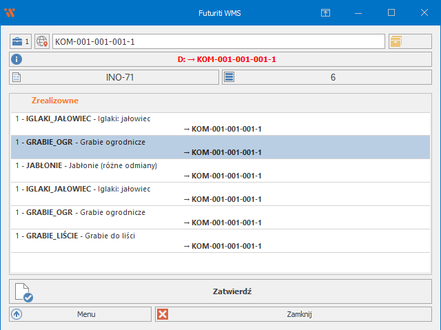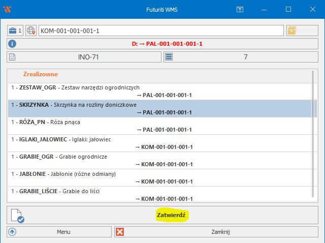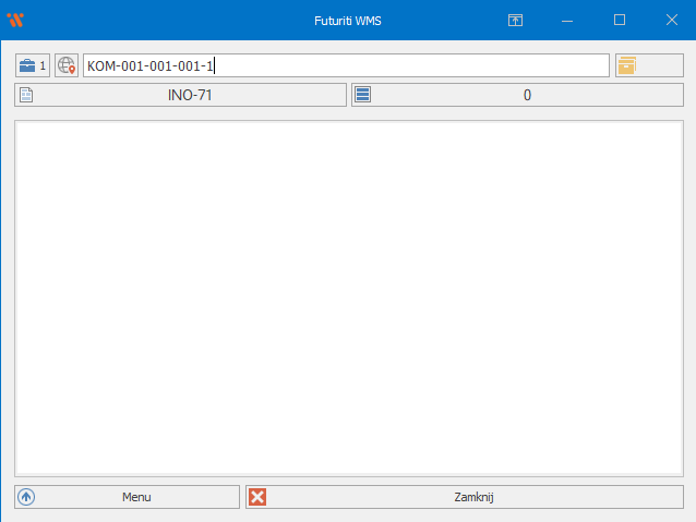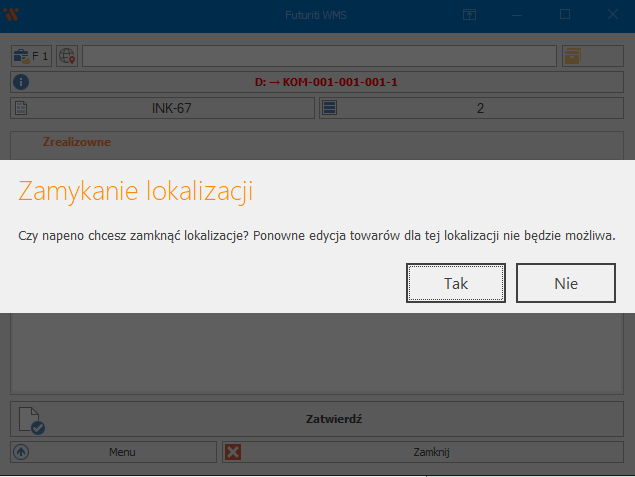 - Po zeskanowaniu wszystkich towarów z wybranego położenia, zamknij lokalizację poprzez ponowny jej skan (albo wpisz ją ręcznie lub wybierz z listy).