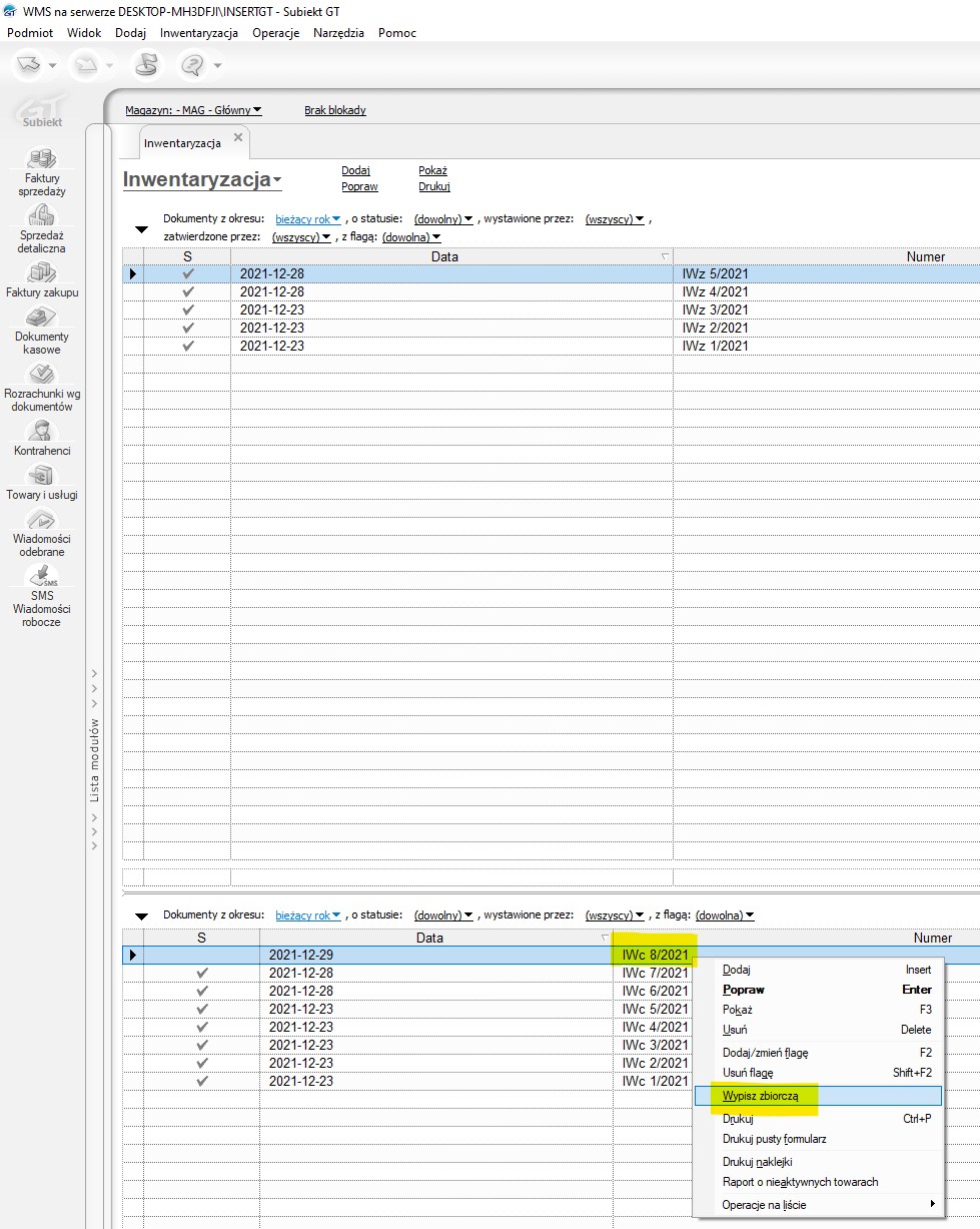 - Po zakończeniu inwentaryzacji w WMS, przejdź do ERP SUBIEKT GT do zakładki INWENTARYZACJA oraz na podstawie stworzonego dokumentu lub dokumentów IWc, użyj przycisku WYPISZ ZBIORCZĄ.