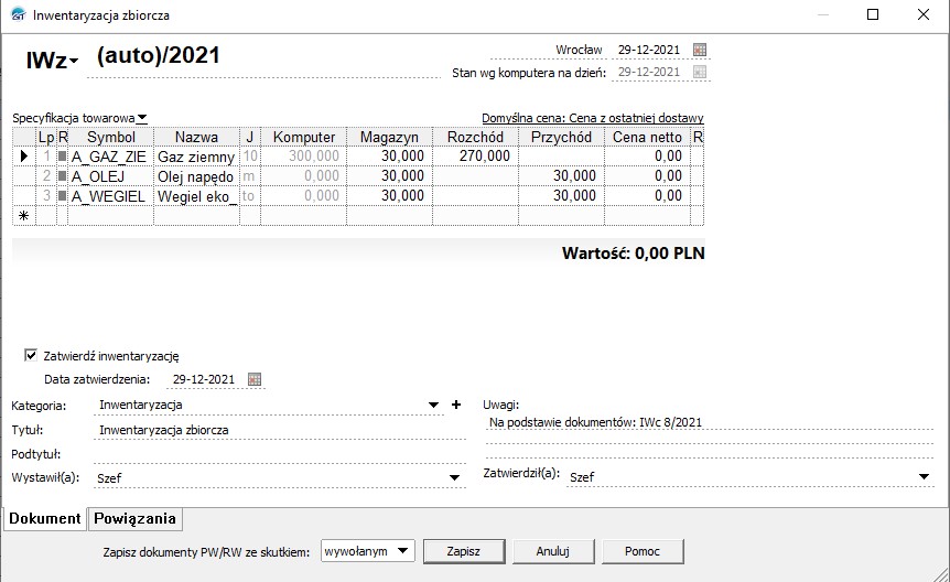 - Pojawi nam się nowe okno z rozpisanymi produktami. Należy zaznaczyć checkbox ZATWIERDŹ INWENTARYZACJĘ i zapisać dokument. Zostaną uworzone dokumenty RW i PW oraz nastąpi zamknięcie inwentaryzacji w WMS.