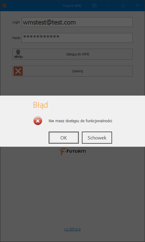 W przypadku, gdy konto użytkownika powiązane jest z kontem Futuriti oraz użytkownik nie posiada dostępu do instancji WMS lub jego konto nie jest przypisane do konta Futuriti ale próbuje uzyskać dostęp do funkcjonalności wymagającej tego połączenia może zobaczyć następujący błąd.