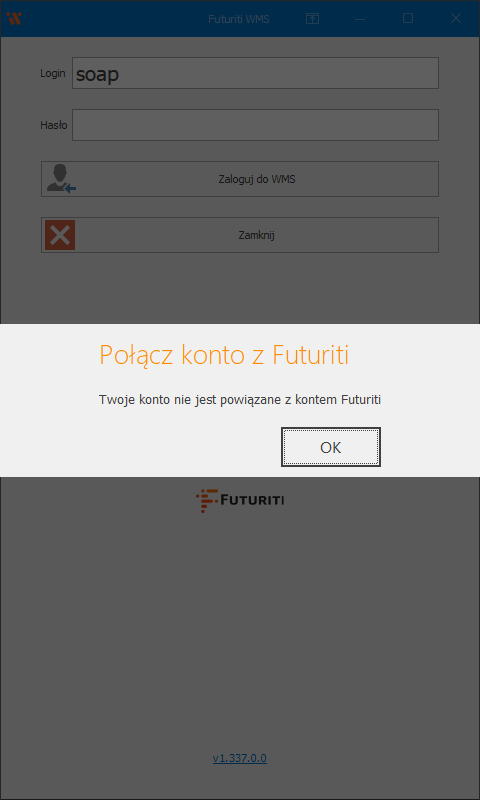 Użytkownik, którego konto nie zostało jeszcze powiązane z kontem Futuriti zostanie o tym fakcie poinformowany, należy połączyć takie konto z systemem Futuriti możliwie jak najszybciej, użytkownik taki nie ma dostępu do wszystkich funkcjonalności WMS