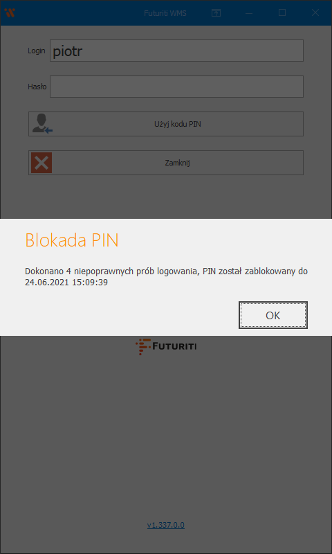 W przypadku zablokowanego kodu PIN użytkownik powinien zalogować się za pomocą hasła do konta Futuriti.