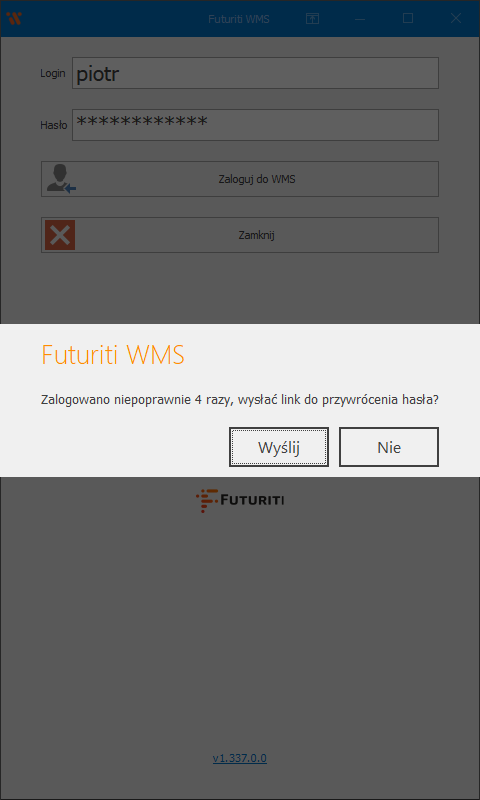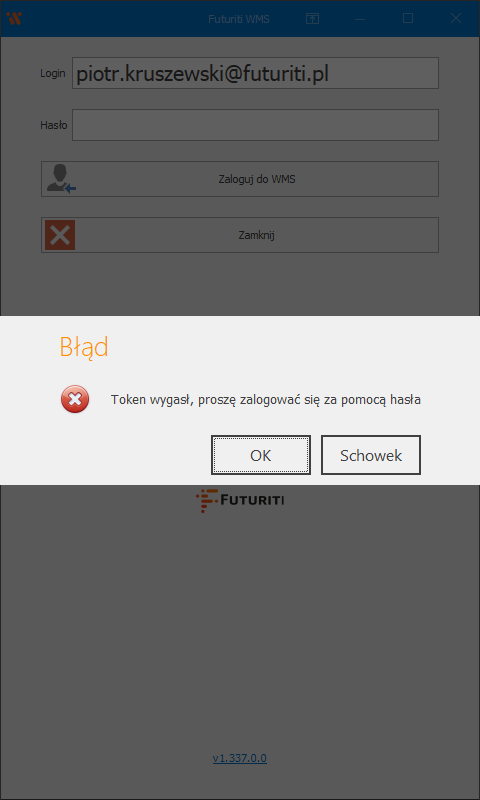Jeśli użytkownik nie logował się do WMS przez okres 14 dni lub po upływie 30 dni, konto wymagać będzie ponownego uwierzytelnienia za pomocą hasła do konta Futuriti