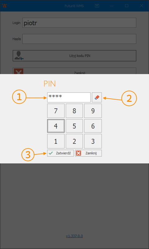 Kod PIN należy wprowadzić w pole tekstowe (1) z klawiatury lub za pomocą panelu numerycznego na ekranie. W przypadku pomyłki możliwe jest wyczyszczenie wprowadzonego PIN’u przyciskiem gumki (2).