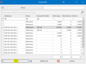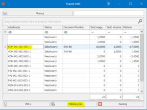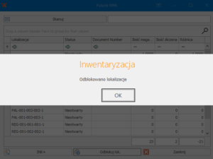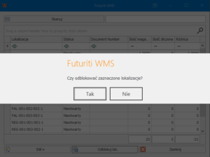 Aby móc wprowadzić korektę towaru, należy użyć przycisku „Odblokuj lokalizację”. Pozwoli nam to na ponowne zeskanowanie towarów z wyznaczonego miejsca.