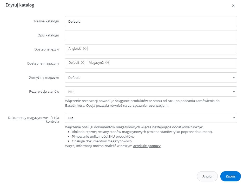 Do WMS pobierane są magazyny przypisane do katalogu ([Dostępne magazyny]) z którego pobierane są towary. Magazyn domyślny dla danego katalogu ([Domyślny magazyn]) ustawiany jest w WMS jako domyślny i ustawiany jest dla wszystkich synchronizowanych dokumentów.